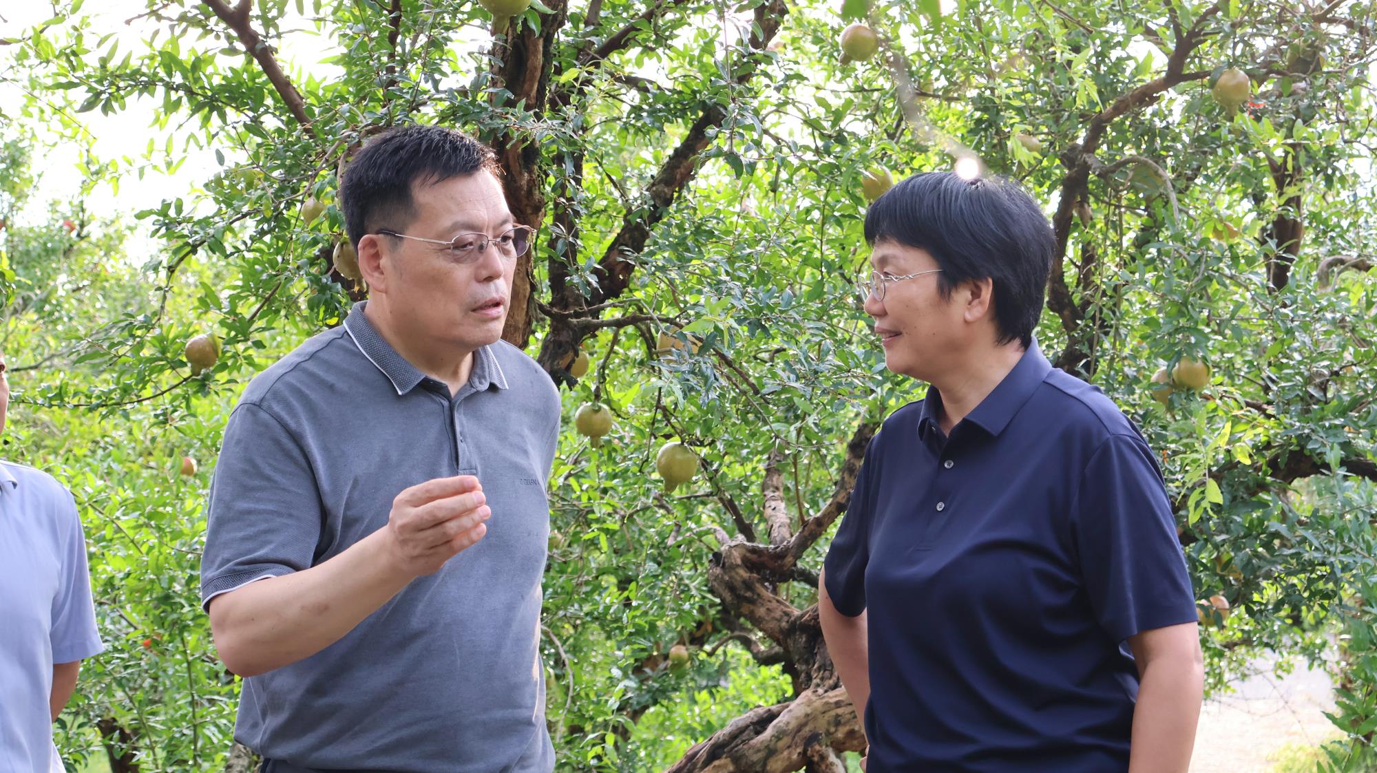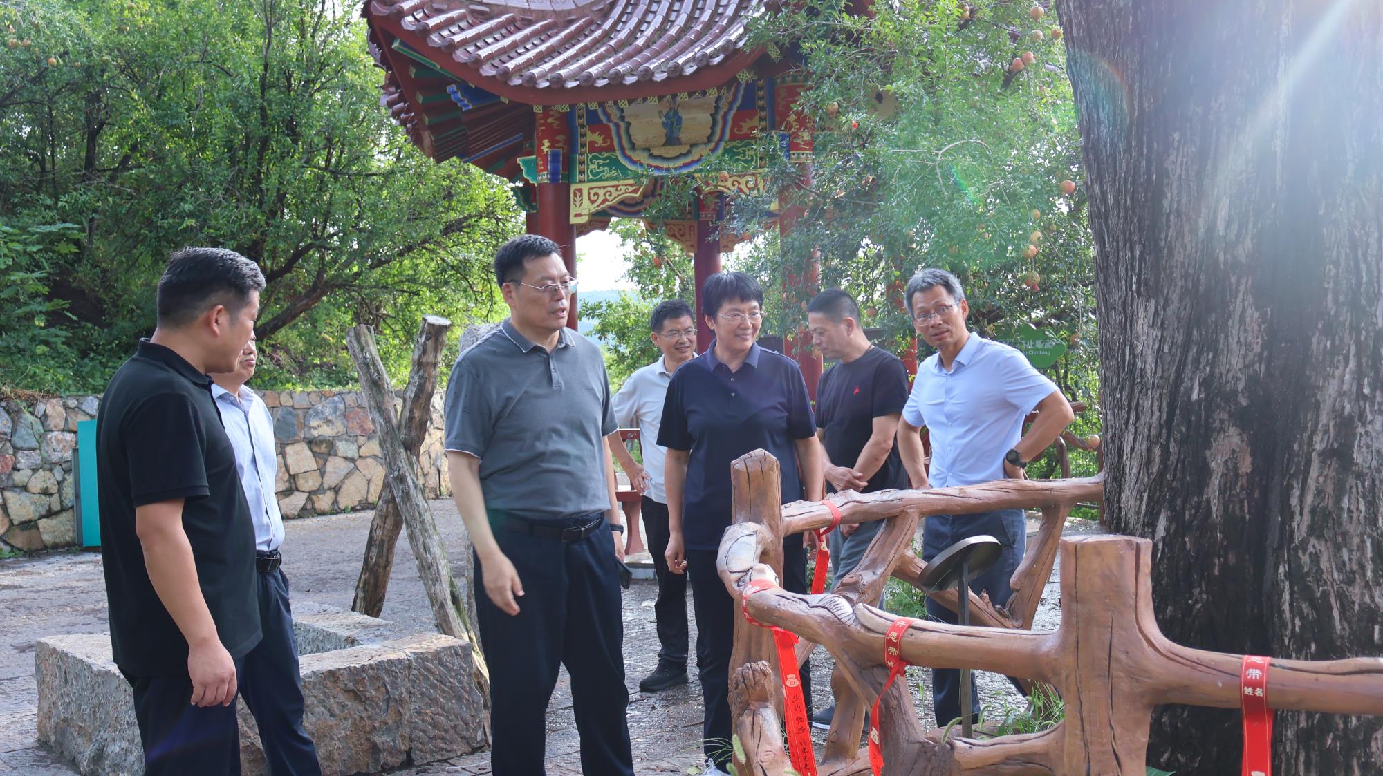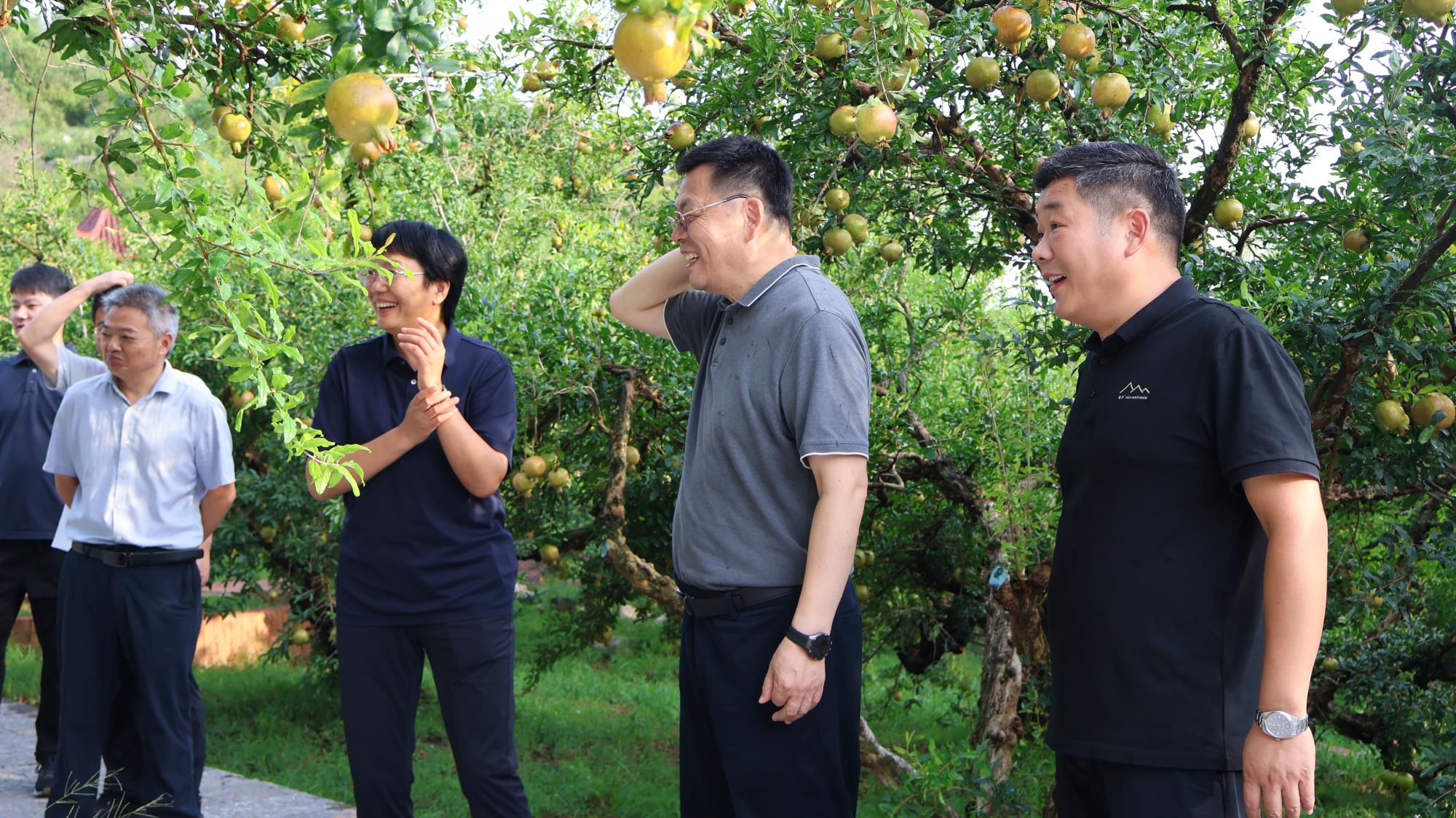 8 月 23 日下午,明清石榴园内,600 年树龄的 "镇园之宝" 枝繁叶茂,饱满的石榴果缀在枝头。北京林业大学林木资源高效生产全国重点实验室主任安黎哲带领专家组一行,在淮北市副市长陈英和淮北市副秘书长程荣华等陪同下,深入这片华东地区最古老的石榴园,就石榴产业发展开展专题调研。
