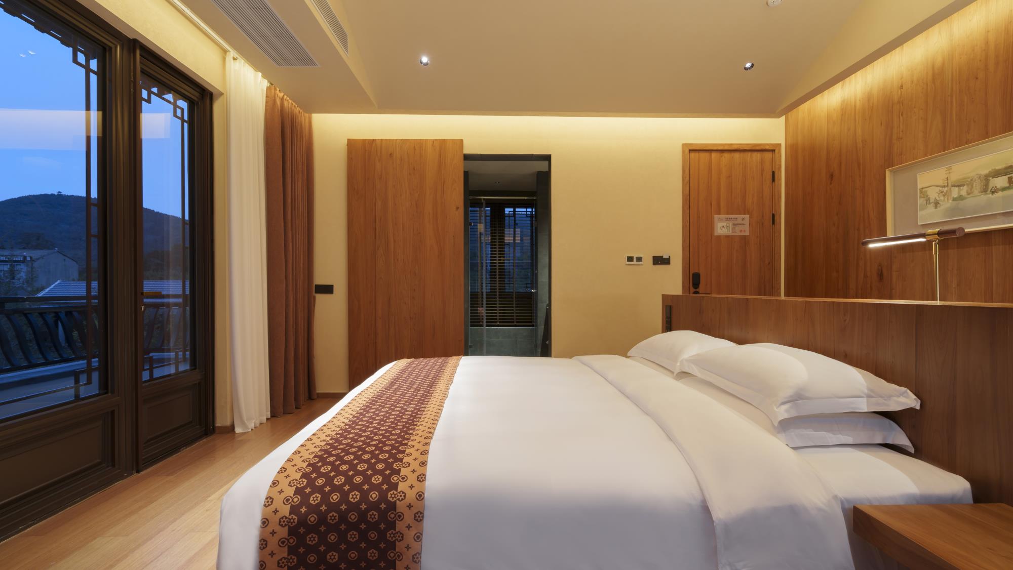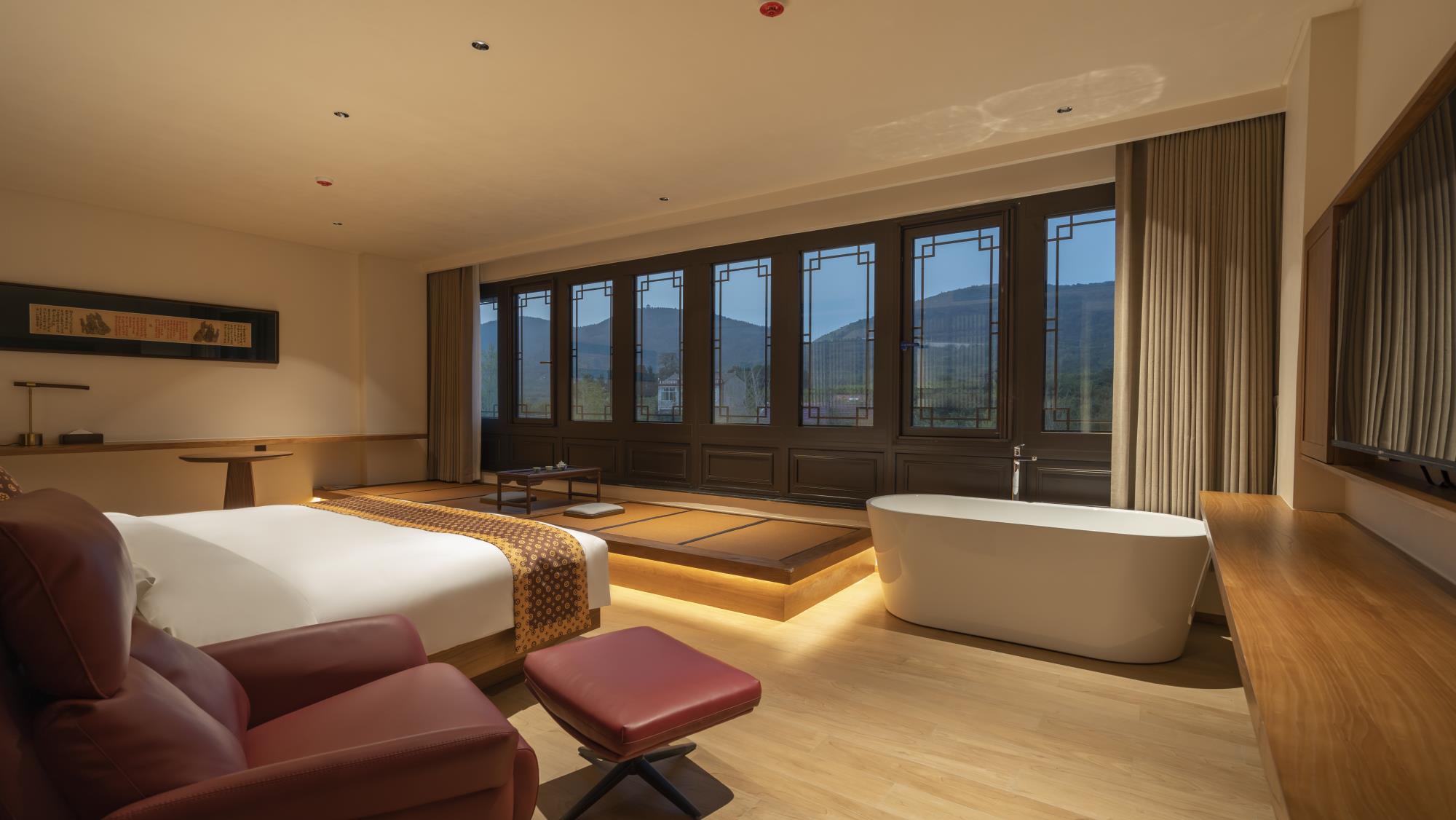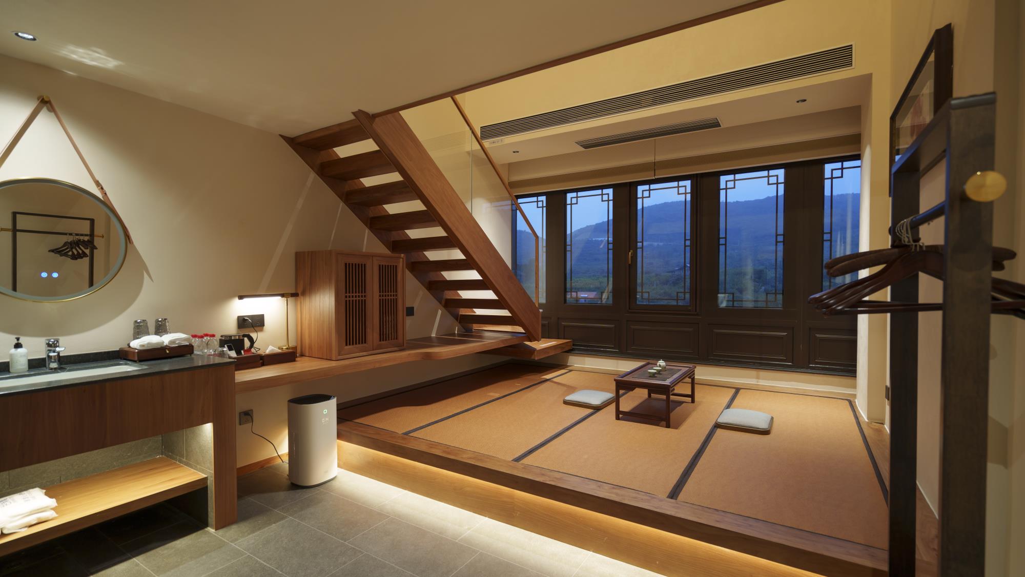 试运营期间,蘧庐民宿就已展现出强劲吸引力,入住率高达90%。七号楼的私汤泡池正对石榴树,夜晚可听着虫鸣泡汤;二楼的270°观景阳台是拍摄榴园晚霞的最佳机位;山居套房的复合空间完美容纳亲子时光。即将开放的八号楼还将新增LOFT复式房型,9种房型覆盖从商务差旅到家庭度假的全需求。